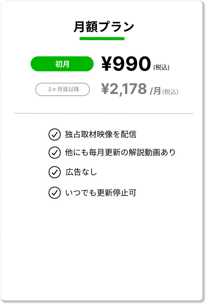 ※本サービスは、毎月自動更新のサブスクリプションです。2ヶ月目以降、税込2,178円/月が請求されます。